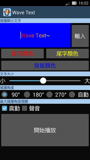 You can also set the color of the first word and the last word. Wave Text will transfer it to gradient color automatically, you can also set the background color, text size, etc. Or set the angle of the wave. Or you can set vibration or sound alerts when you wave to maximum angle. It can also be set to auto mode which means you don't have to wave to display the message, it will display automatically like marquee in auto mode (auto mode can adjust the text speed).