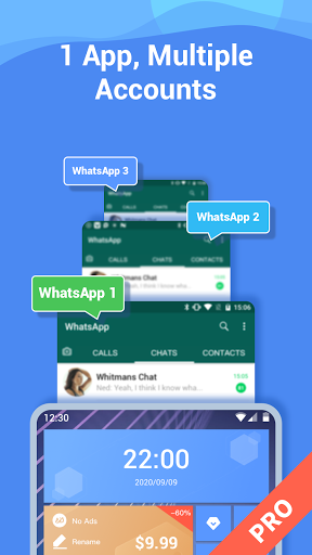 · In 2Space Pro, you can quickly clone any application through app cloner, such as cloning WhatsApp Messenger to get 2 WhatsApp apps. After that, you can log in to 2 accounts for 2 WhatsApp in one phone at the same time.
