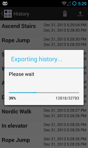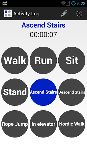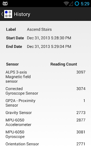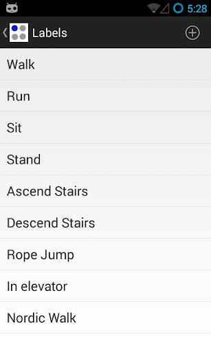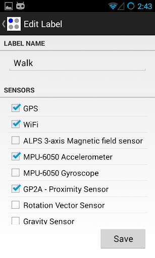 Log, label and export sensory data. This application is developed to ease the process of collecting and labeling sensory data from smart phones. Enter a label and choose associated sensors from available device sensors. Specified label appears as a round button on the application home screen and when the button is tapped, associated sensors begin recording data. Data are stored in the sqlite database and can be exported in CSV format. Collected data can be used to study various research questions in various fields such as activity recognition, indoor localization and context-aware computing.