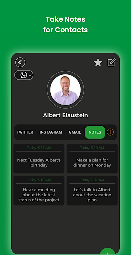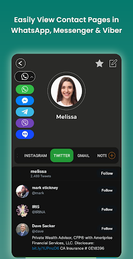 No need to open different social media apps everyday to view a contact’s new posts. Choose a contact from your Contact list and put their usernames on social networks. Then, you can quickly view their profiles and new posts from Facebook, Messenger, Instagram, Twitter, and blogs in one place.