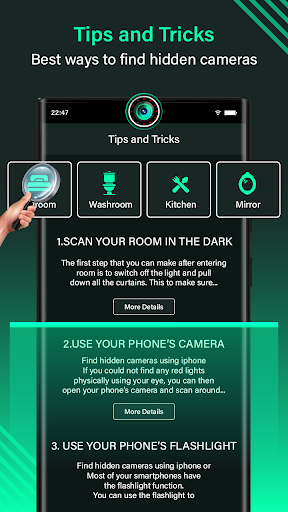 This hidden camera finder app is easy to use and provides clear, accurate results. It is equipped with an EMF detector, EMF readers, spyfinder, RF signal detector, spy finder, and anti-spy detector, making it a comprehensive solution for protecting privacy. Whether you're concerned about hidden spy cameras in your home, workplace, or hotel room, the Hidden Camera Detector Application provides the peace of mind you need, knowing that you're protected from unwanted surveillance.