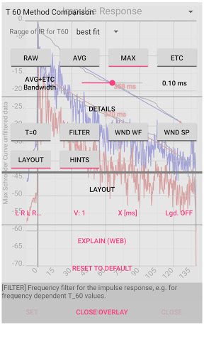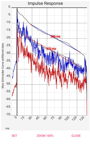 - Impulse response - logarithmic: raw data, smoothed data, maximum values, Energy-Time-Curve, Schroeder Curve