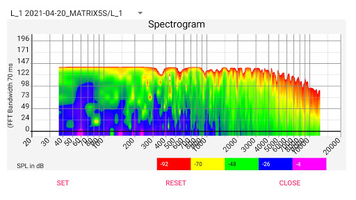 - Waterfall display (time evolution of frequency response) via wavelet or FFT analysis