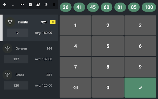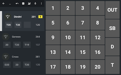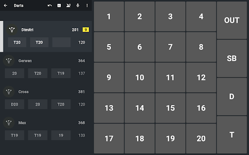 Welcome to our unique darts scorekeeping app! Our special feature is a virtual dartboard where you can enter your score by tapping directly on the dart fields. It's like having a real dartboard in the palm of your hand!