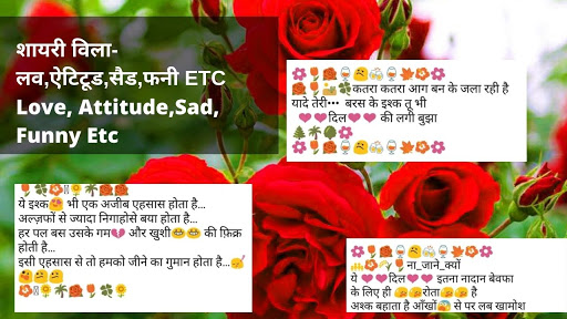 This type Shayari covered in this app Hindi Shayari (Love, Ishq, Pyar Mohabbat, Attitude Shayari,Mother Shayari,Josh Shayari,Love Quotes, Motivational Shayari, Funny Shayari etc).