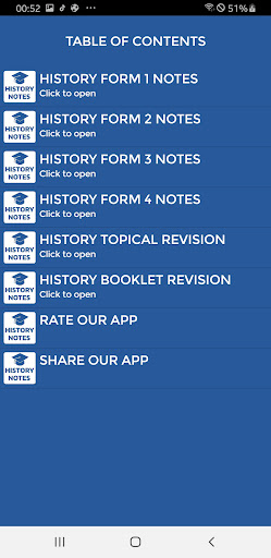 The app contains the following revision materials; 1. History and Government notes. 2. Topical revision questions with answers. 3. Past KCSE papers.