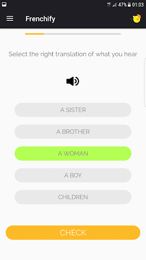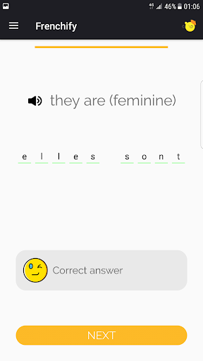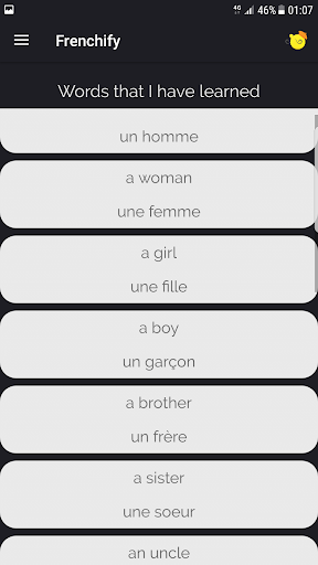 Since the app remembers the words you have learned, once you have completed the whole session of seven categories you are frenchified to the basic level! If you wish to start over again, click "Reset my progression" on the left side menu.