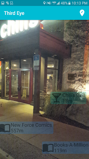 Third Eye is an augmented reality navigation and exploration overlay that binds data from nearby locations to corresponding objects in the real world. By fusing your accelerometers and magnetometers with Google's Places and Location APIs, you'll have access to detailed information about restaurants, cafes, transit stations, and many other locations near you. With Third Eye, you can navigate without staring down at a map and get ratings and reviews without the need to search!