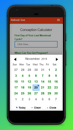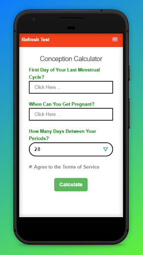 Conception Calculator, or Conception Predictor is application which is Calculate probability of becoming pregnant on any day. Insert First Day of Your Last Menstrual Cycle? Then insert When Can You Get Pregnant? And choose How Many Days Between Your Periods? Finally calculate probability of becoming pregnant on any day.