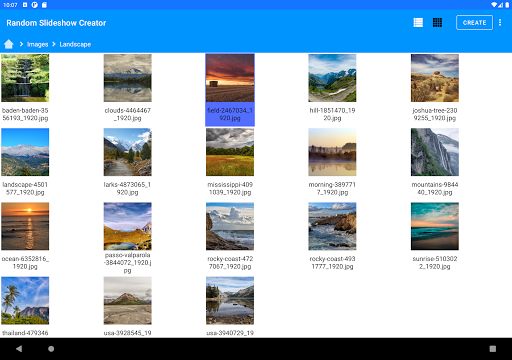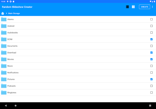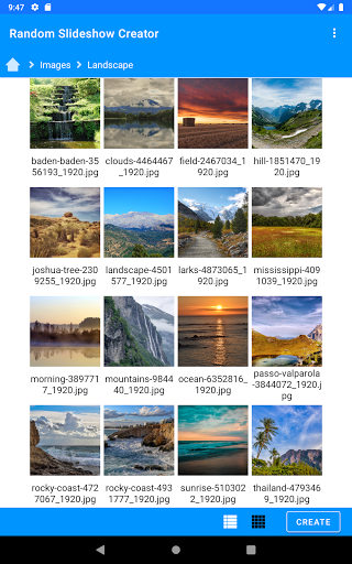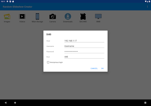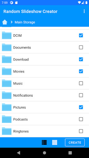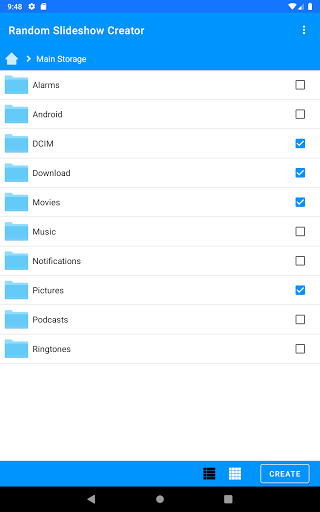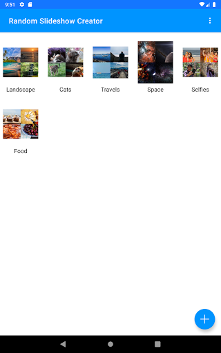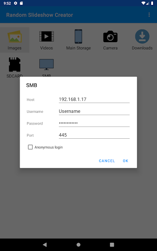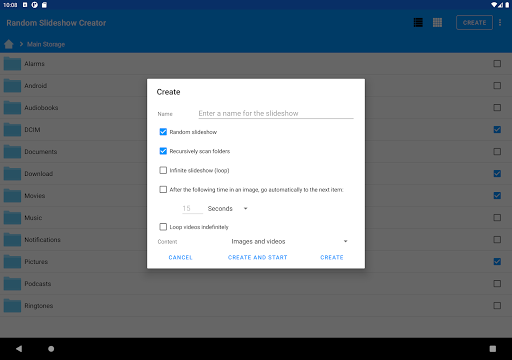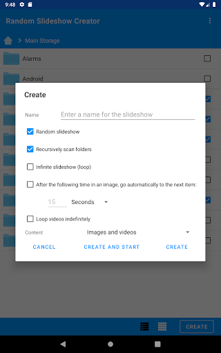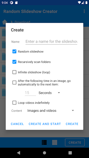 The app allows you to create and view slideshows of photos and videos from any (and multiple) filesand folders in your phone. The premium version also allows you to specify files and folders in your PC through SMB.