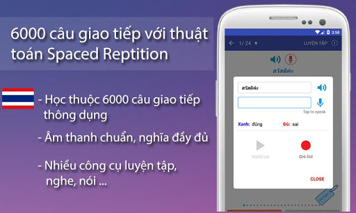 Các bài luyện tập trong học tiếng Thái Lan giao tiếp được thiết kế để giúp bạn luyện tập, tự học tiếng Thái Lan như đang chơi game, giúp bạn không nhàm chán khi tự học tiếng Thái Lan với ứng dụng này