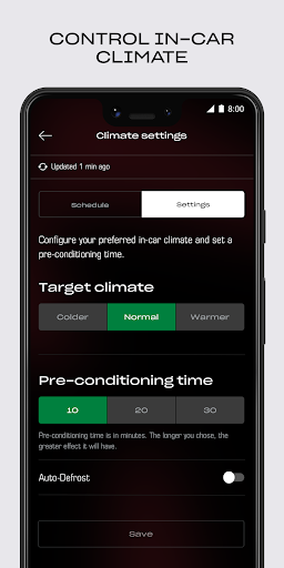 • Set a target in-car climate using pre-conditioning and schedule when you would like your climate control to start each day.