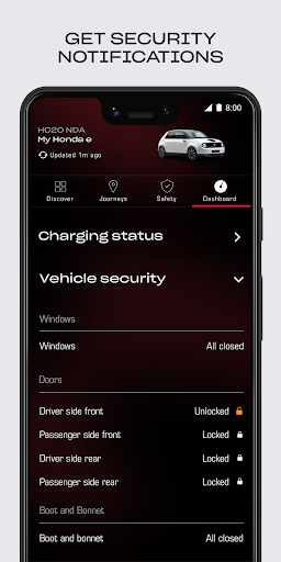 • Monitor the security of your car and receive alerts if windows or doors are open or unlocked, with the virtual dashboard.