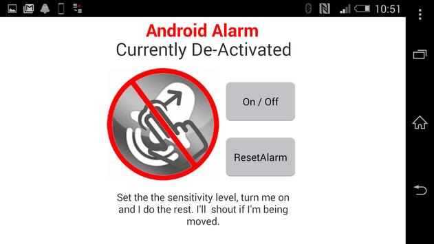Android Alarm is a movement sensor activated alarm. If you like to leave your mobile phone or tablet unattended, you can activate this app to help to monitor it for you. Activate the app and you can go on with your activities. When someone tries to move or remove it, the alarm will be activated to alert you of what is happening.