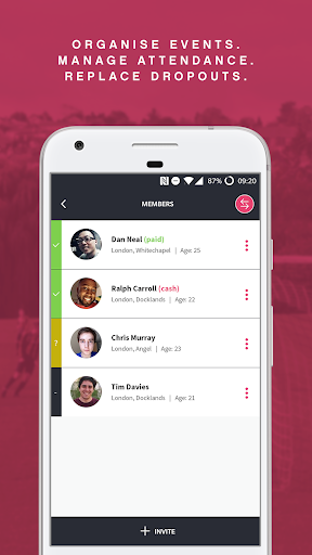You can use the app either as an organiser or as a participant. As an organiser you create your event, manage payments, use waiting lists and internal group chats to avoid drop outs and make events recurring to cut down on hassle.