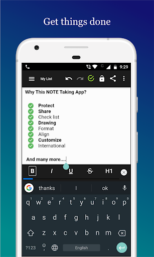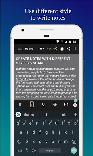 With the notebook alignments features you can create lists, simple text, draw, checklist or ordered text. On top of that you are having a rich text editor to make the letters bold and change the font color. With text editing and drawing options you can create lists and text as you want. Share anywhere you like as pdf, image or just as text. We simplified the note creation process and sharing