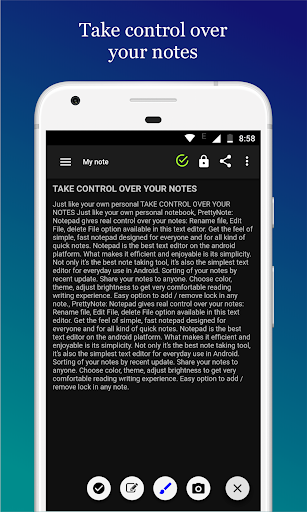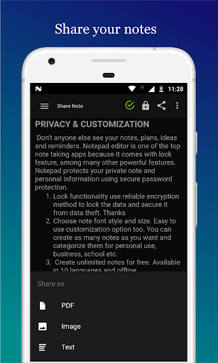 Don’t anyone else see your notes, plans, ideas and reminders. Notepad editor comes with lock feature, among many other powerful features. Notepad protects your private note and personal information using secure password protection. Lock functionality use reliable encryption method to lock the data and secure it from data theft. Choose note font style and size. Easy to use customization option too. You can create as many notes as you want.