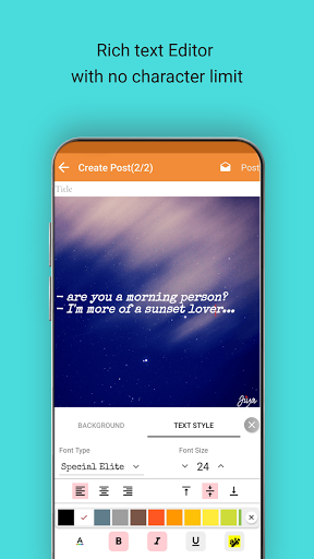 Start writing a post and you can design your post in a powerful Rich Text editor with beautiful wallpapers as background. No more same text formatting of the whole content.