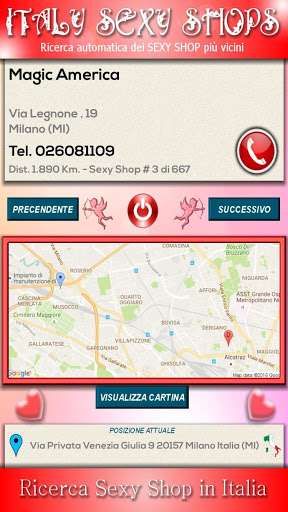 Italy Sexy Shops è l'app che fa per te. Ti basta avviare l'applicazione per visualizzare immediatamente il Sexy Shop più vicino a te. Puoi scorrere tutto l'elenco ordinato per distanza e telefonare al negozio che preferisci direttamente dall'app.