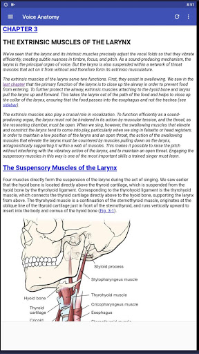 The larynx itself is suspended within a network of muscles—sometimes called the extrinsic muscles of the larynx—that move the structure when we swallow and help it to function. These constitute the third system we will examine. Although the role of these muscles in swallowing is well understood, their role in vocalization has been largely misunderstood and underestimated. We’ll look at the function of these muscles in Chapter Three.