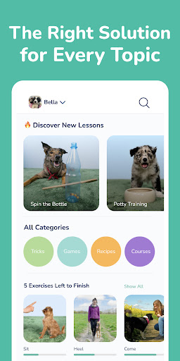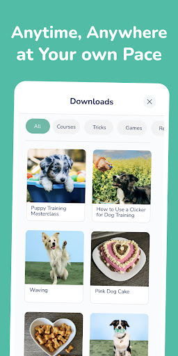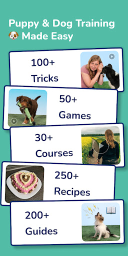 Discover a wide range of tricks, games, and recipes for dogs. Get inspiration for your next training session and have fun together. In this app, you can find for example these course topics: Basic Commands, Puppy Basics (Walking the Pup, Potty House Training, Bite inhibition, Puppy Nutrition, Puppy Games, Puppy Commands), Leash Training, Recall Masterclass, How to ignore other dogs on walks, How to behave during a visit, Clicker Course, Dog Impulse control Guide, Health Check at Home, Raw Food Diet, Muzzle Trainer, Calm at Office, New Year's Eve Training, Stop your dog from eating random things, Stop Barking Trainer or Stay Alone Course for Dogs.