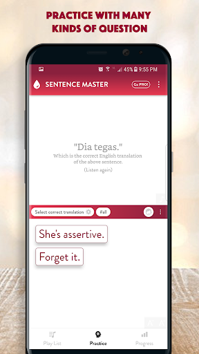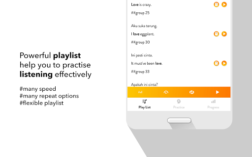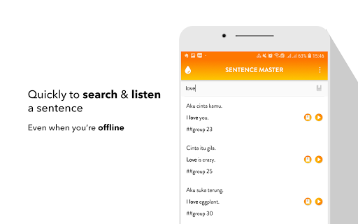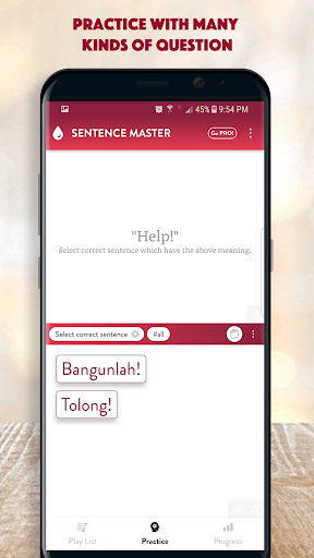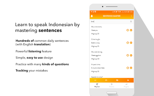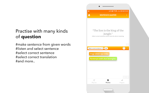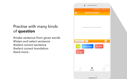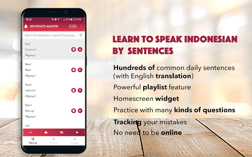 All the app's features are designed to help you learn to make Indonesian sentence and improve the main skills: Listening to a sentence, writing (making) a sentence correctly, speaking a sentence/a phrase correctly.