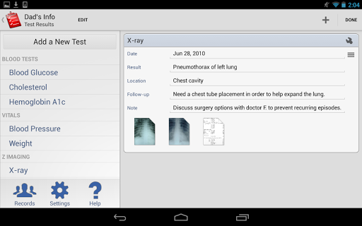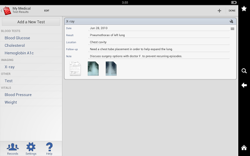 My Medical provides a range of common test result templates for you to track test results. To name just a few: blood pressure; cholesterol; metabolic panels; blood sugar; CAT scan; height and weight. If that isn't enough, construct and customize your own test results to keep track of exactly what you need.