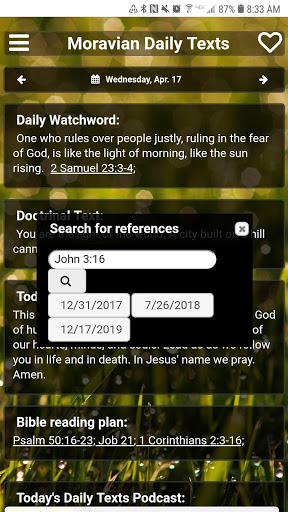 Excellent app! I love having options for accessing my daily text. The app is well put-together & visually pleasing. You can search for scripture to see where it's been used. I would love the option to "search" for a particular day instead of flipping through, but I appreciate that I can flip to other days- this is useful for church agendas and things!