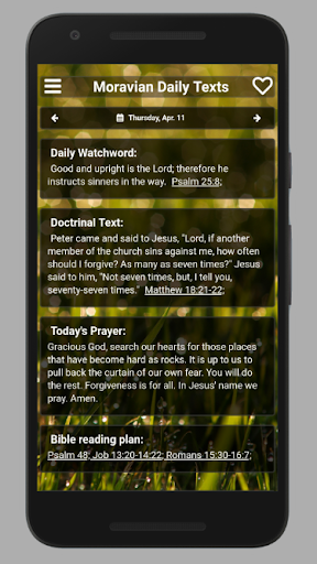 Each day, the Daily Texts app offers these verses and prayers, along with links to the full Bible verses in context (note: web access is required for this feature). In addition, the Daily Texts app includes a plan that guides readers through the Psalms in one year and the Old and New Testaments in two years.