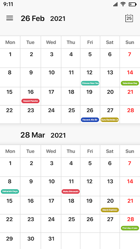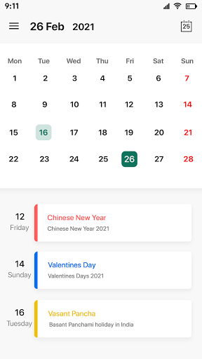 • Track upcoming long weekends and holidays in flag calendar with holidays