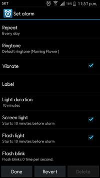 For "screen light" and "flash light" you specify time intervals, that mean that this action starts N minutes (specified interval) before main alarm time. For example, if alarm is set at 8:00 and screen light is enabled with interval set to 10 minutes, than screen light starts at 7:50 and main alarm begins to play at 8:00.
