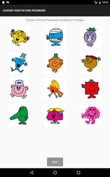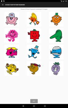 The App lets you create Your Picture Password using this Mr. Men Little Miss keypad. Your Picture Password is the same four images on the keypad, in the same order every time.