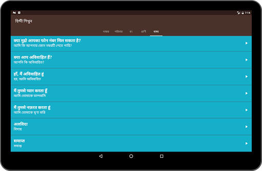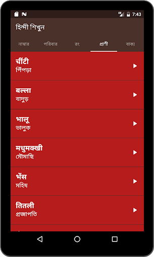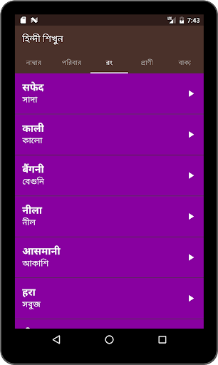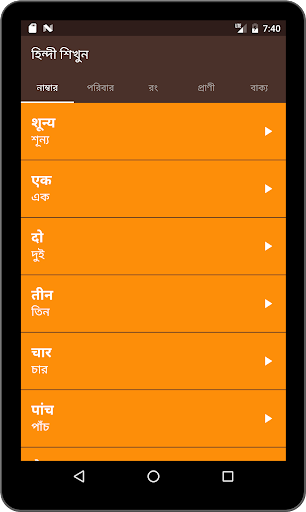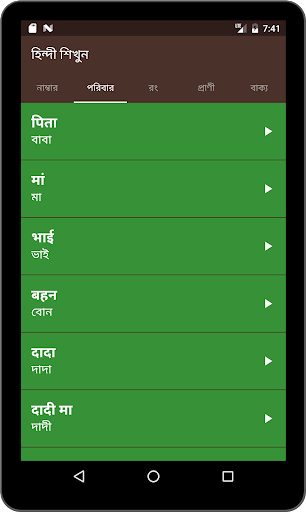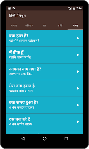 Sie können Hindi mit sehr einfacher Äußerung durch das lernen.Jedes Wort und jedes Wort werden Bengali-Geld gegeben.Sie können die Hindi-Aussprache hören, wenn Sie auf das Wort oder auf den Satz klicken.