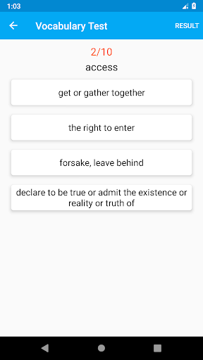IELTS Essential Words Test is a very helpful application contain a giant collections of IELTS Vocabulary questions. This app is suitable for all Beginner, Intermediate and Advance levels user.