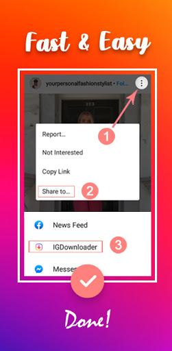 Let’s assume you’re scrolling through your insta feed, and a certain IG video caught your attention, and you wanted to save that video to your phone or tablet to view it later while offline, or share it with your friends or even repost it on any social media plateforme; as explained in the screenshots, all you need to do to save the IG video to your device is (1) click the post option button on the top right corner above it, (2) click Share to.. From the popup that will appear, and finally (3) choose IGDownloader to share,