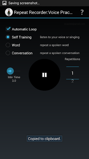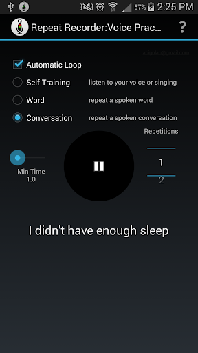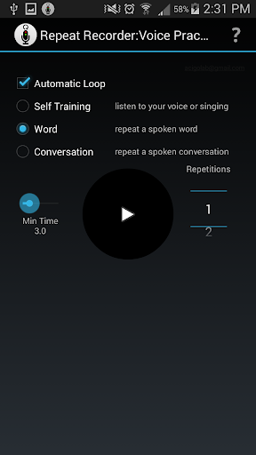 Don't waste time tapping buttons to listen back to your voice in ordinary voice recorders. Unlike other recording apps that require the user to press a start and stop button, this app automatically stops recording as soon as it detects that the speaker has finished speaking. Then it continues in a loop until you terminate this app (press the BACK button).