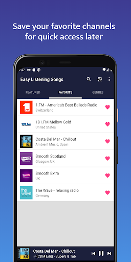 Listen a selective list of Easy Listening Songs from all the world with a very easy interface. Variety of radio stations. Stations are dynamically loaded, we will be adding more and more stations without you need to upgrade the app. The most personalized sleep and relaxation experience that you can possibly have.