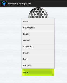 Vous pourrez transformer votre voix en celle d'un Ghost, Slow Motion, Robot, Normal, Chipmunk, Funny, Bee, et Elephent; Cela est facile avec l'application "Changer la voix gratuitement"