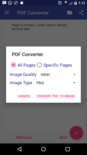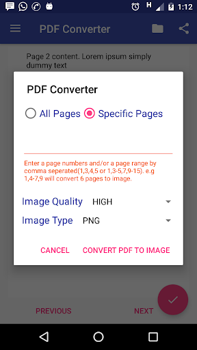 A PDF Converter app has an option to select all page or specific page to convert to an image.