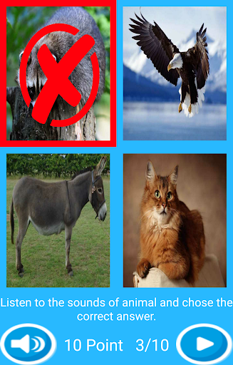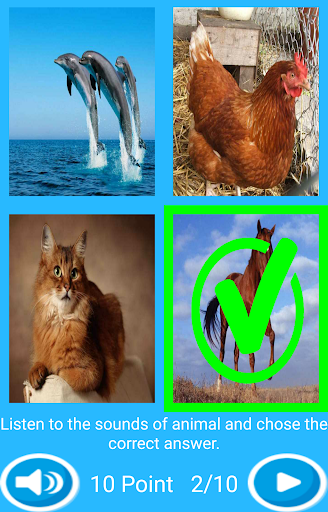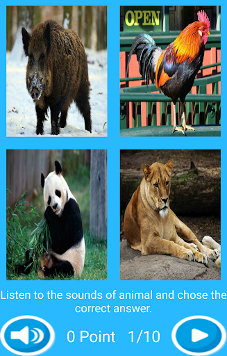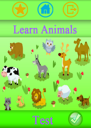 This application has been created to provide contributions to improve children's visual and Auditorial intelligence. Through this application children learn the names and sounds of animal. The application has two parts. In the first part, children see the pictures of animals and learn their names and sounds. In the second part,there is a ten-question-test with four multiple choices. Children listen the sound of an animal and choose the correct option for that sound.Children get 10 points for each question.