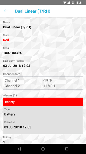 Sensor detail screen; Sensor overview, Alarm detail, acknowledgement notes and commands and sensor data.