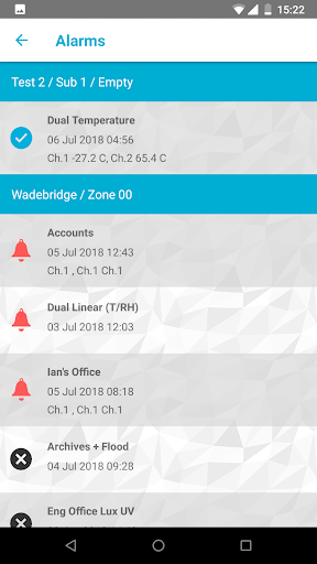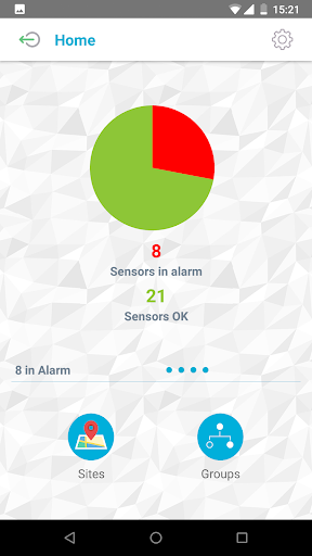 Alarm screen; status of groups, sensor names, alarm reading. Further data can be accessed upon user interaction, such as alarm detail per sensor.