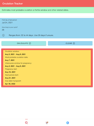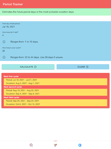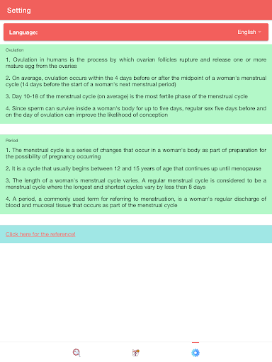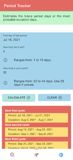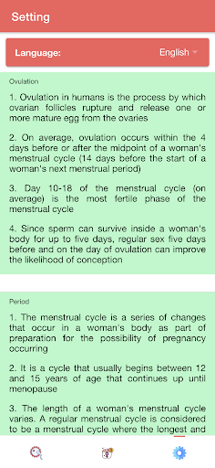 "Ovulation & Period Tracker: Fertility Calendar" also has period tracker feature. This feature will allow you to determine your next period. Period days are the days during which bleeding and discharge occurs. In this feature, "Ovulation & Period Tracker: Fertility Calendar" will also determine the most probable ovulation days which are the days during which a woman is most likely to ovulate.