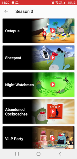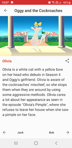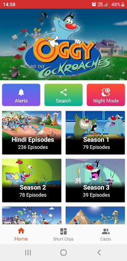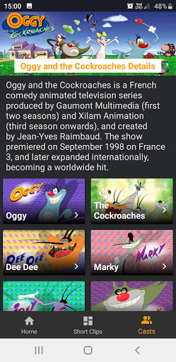 Oggy and the Cockroaches App contains all the seasons, episodes with story-line, characters and clips. It is a story of a Oggy, a blue cat, prefer to spend time on watching TV and eating. There are three cockroaches: Joey, Marky and Dee Dee, Oggy continuously pestered by these three cockroaches. Oggy is also helped by Jack, who also annoyed by the cockroaches. Bob, a bulldog, also appears, and is Oggy's neighbor.
