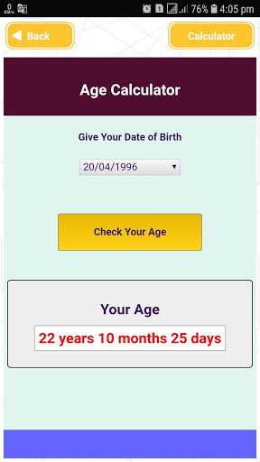 Hindi ~ Free Easy Calculator is an awesome application to calculate your age. To find actual age and days between two dates is very hard. Many people don't know how to calculate age from date of birth. It is very easy