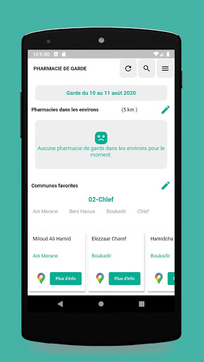 Il suffit de choisir votre wilaya et commune pour afficher une sélection de pharmacies de garde qui se trouvent dans votre localité. En cliquant sur la pharmacie de votre choix, vous aurez accès à toutes les informations la concernant : Nom, adresse et période de garde. Une icône indique si la pharmacie ouvre le jour (soleil) ou la nuit (croissant).