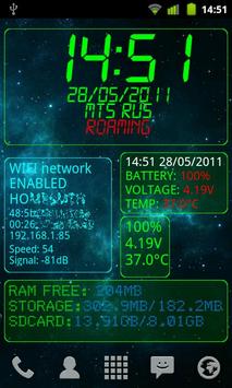 Fully customisable widget with templates. Shows over 50 system parameters (network, WiFi, bluetooth, memory, storage, battery). Additional 40 parameters is available with PRO version.