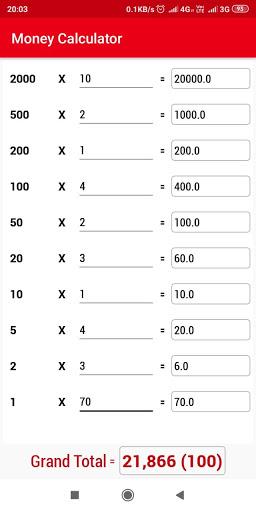 This app is specially developed for the user to calculate a daily money count like cashier... Features:- => Easy to use => Special Design for Indian currency => In this app calculate Money Total & Notes count