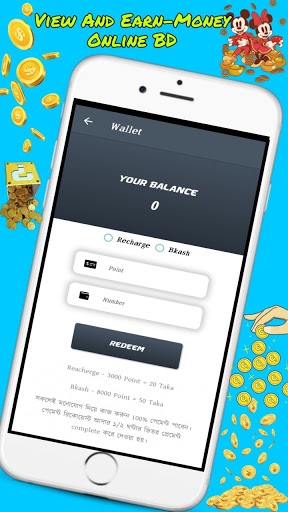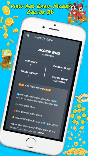 Work To Earn This is the first genuine app where you can watch ads and earn free money. All you have to do is use the app daily, You can earn free Bkash cash. We work on a profit sharing model, we share 90% percent of our earnings with the users. Earn 101% Money. How does it work? How to Withdraw money? -> Register With valid number. -> and you can add money into Bkash. First of all Follow tips that is really easy for eveeryone. click on Go button. you have to complete task and get 10 Tk. The task is very simple, just click button and view advertise. And You Can Earn Extra 50% By Inviting Your Friends.