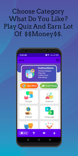 instantly which helps to update our knowledge. This app rule is to choose a category in which you like to play quiz Collect Coins and Earn money. This app has fun which gives you a fresh mind.